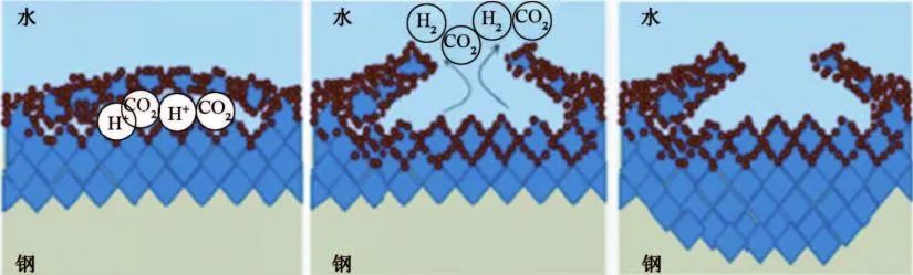 煙道氣組分是影響煙道氣回收及注入系統(tǒng)腐蝕的最重要因素,決定了腐蝕的類型及機(jī)理。若煙道氣中僅含有CO2、N2、O2和水蒸氣,那么該環(huán)境中的腐蝕主要受O2和CO2協(xié)同作用,O2的存在會(huì)使腐蝕產(chǎn)物由單一CO2腐蝕產(chǎn)物FeCO3轉(zhuǎn)為鐵的氧化物,導(dǎo)致腐蝕產(chǎn)物保護(hù)性降低,腐蝕速率增大。林海認(rèn)為這是由于O2的強(qiáng)氧化性和陰極的吸氧反應(yīng)加速了陽極金屬的溶解,同時(shí)Fe2+氧化為Fe2O3或Fe(OH)3,而易沉積的Fe(OH)3為疏松多孔結(jié)構(gòu),無法充分保護(hù)基體金屬。O2對(duì)CO2腐蝕產(chǎn)物膜的破壞機(jī)理見圖3。然而,部分研究者認(rèn)為,O2、CO2共存時(shí)O2的影響程度取決于其相對(duì)含量。