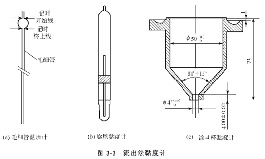 通過測(cè)定液體涂料在一定容積的容器內(nèi)流出的時(shí)間來表示涂料的黏度。依據(jù)使用的儀器可分為毛細(xì)管法和流量杯法(見圖3-3)。這是比較常用的方法。