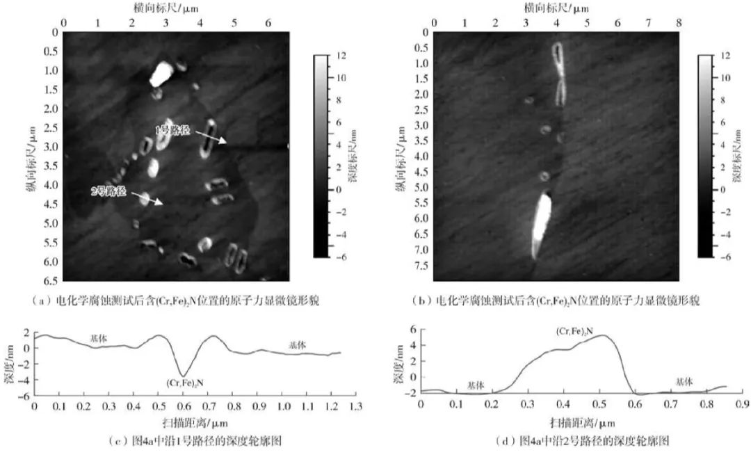 Zhang等指出夾雜與鐵素體或奧氏體邊界處形成的鈍化膜不完整并容易發(fā)生局部腐蝕。但是夾雜不會致使周圍鐵素體或奧氏體形成貧Cr/Mo區(qū)。富Cr和Mo元素的二次相析出可能致使相鄰邊界產(chǎn)生Cr和Mo元素的貧化區(qū),貧化區(qū)的PREN較低,會優(yōu)先發(fā)生點蝕。但最近Erazmus-Vignal等提出了新見解,他們認為Cr2N析出不會導(dǎo)致貧Cr區(qū)形成,局部腐蝕的產(chǎn)生是由Cr2N溶解形成縫隙并進一步加速腐蝕而導(dǎo)致的,如圖4所示。